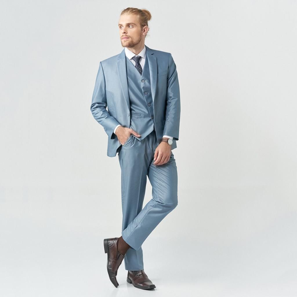 Terno azul jeans, podendo ser usado com ou sem colete colete.