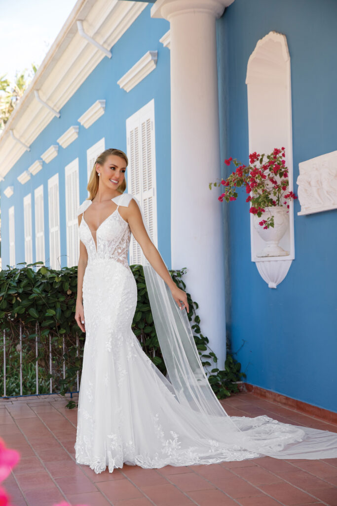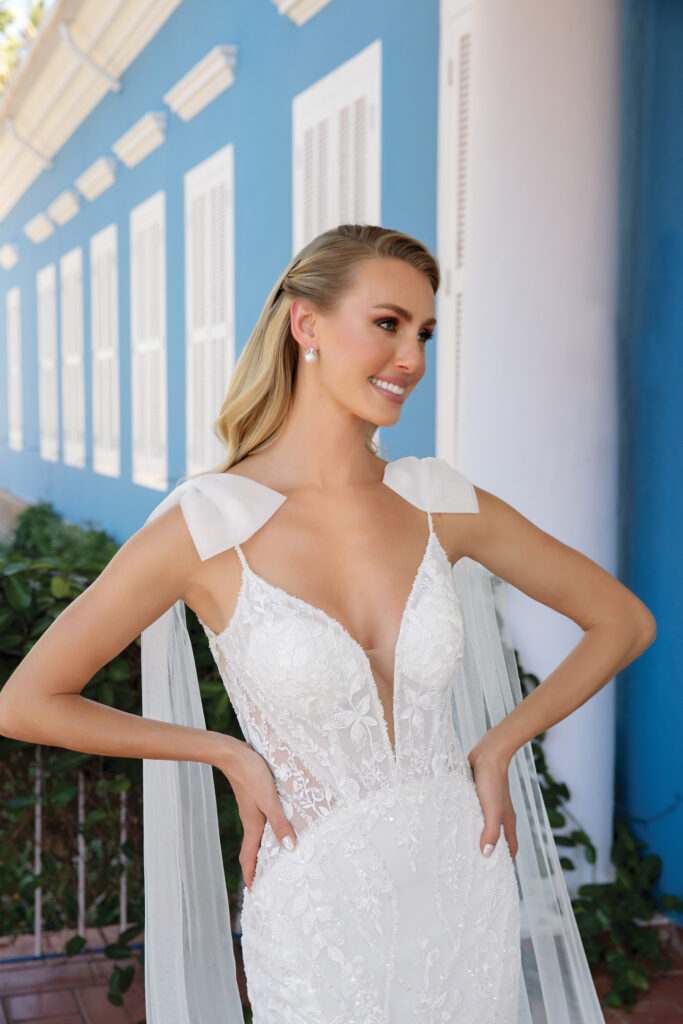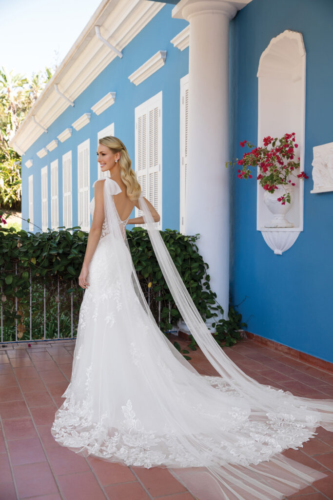 Cauda com design floral. Acompanha body manga longa e mangas removíveis em tule com aplicações de renda bordadas com pérolas, miçangas, paetês e vidrilhos