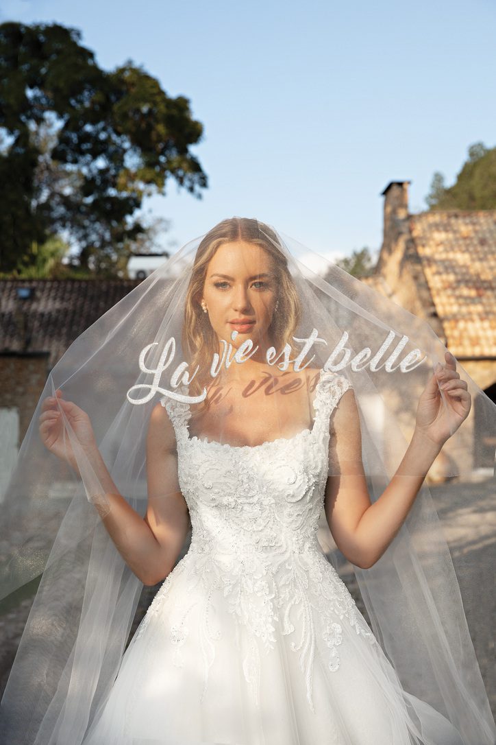 Vestido rodado, decote quadrado (Off-white) com saia de tule com barrado e aplicações de renda fio de seda;