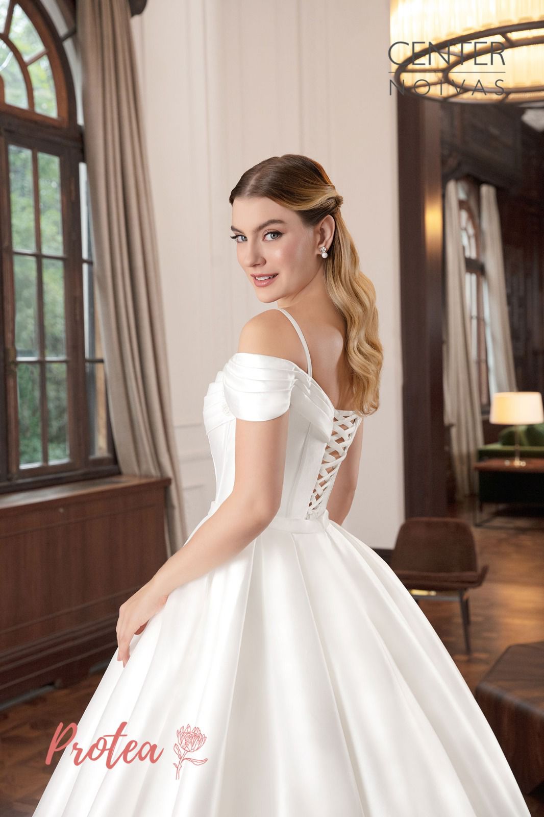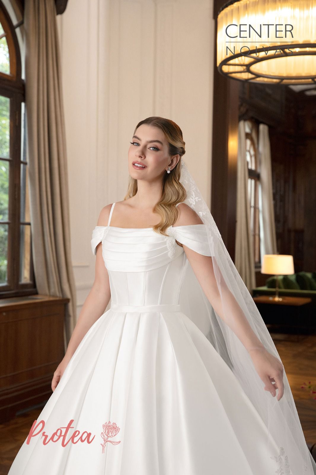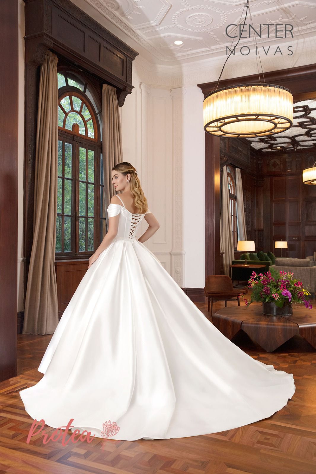 Manguinhas e busto drapeado detalhe bordado por miçangas, pérolas e canutilhinhos na lateral.