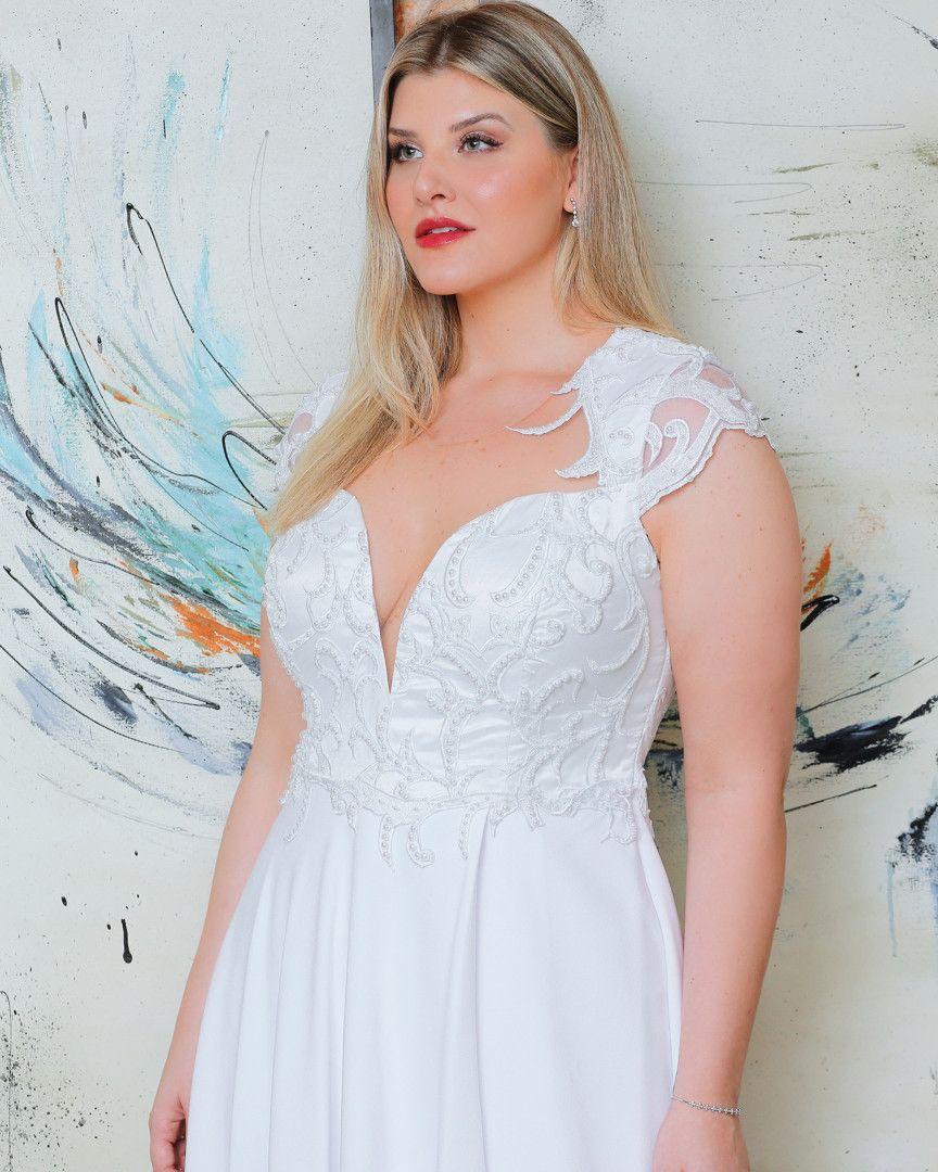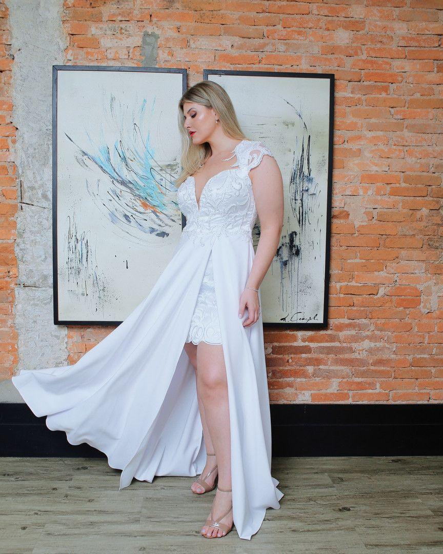Contem detalhe de sai curta rendada, sobreposta com saia longa.